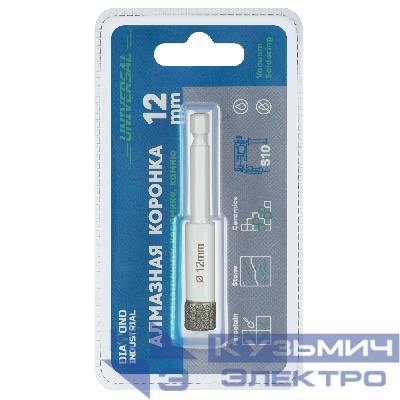 2256 | Diamond Industrial Алмазная коронка по керамограниту, керамике и камню 12 мм Universal Diamond Industrial, вакуумная пайка, 1/4" HEX