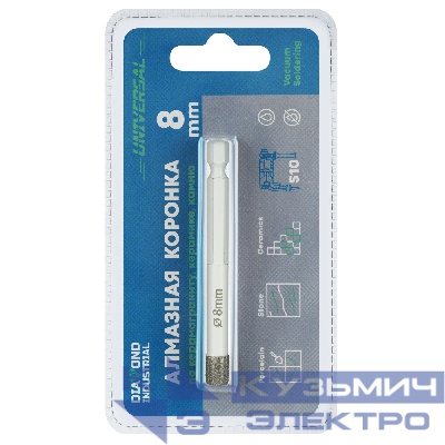 2254 | Diamond Industrial Алмазная коронка по керамограниту, керамике и камню 8 мм Universal Diamond Industrial, вакуумная пайка, 1/4" HEX